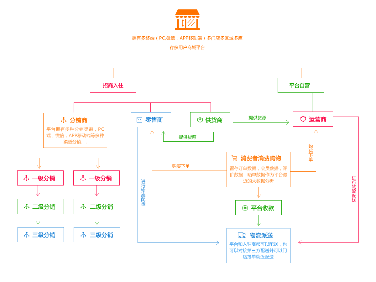 店區(qū)域配送,再到終端顧客,形成一個(gè)完整的電商生態(tài)系統(tǒng)。