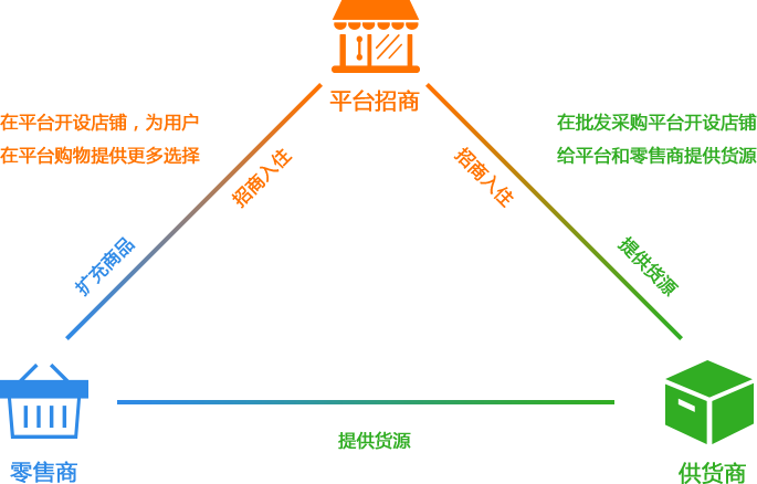 還可以招納供貨批發(fā)商,為及零售商解決貨源問題,讓入駐的商家更快速的開店運(yùn)行