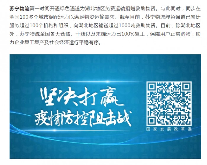 疫情當(dāng)前,運(yùn)輸線就是生命線。3月10日,國(guó)家發(fā)展改革委發(fā)文,點(diǎn)贊蘇寧物流為抗擊疫情、保障民生發(fā)揮的重要作用。