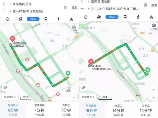2017年12月26日,京東7FRESH在亦莊大族廣場(chǎng)開(kāi)設(shè)了第一家門店,這家店離京東總部6.5公里,在路況好的時(shí)候大約需要15分鐘的車程。然而好景不長(zhǎng),不到一個(gè)月,阿里的盒馬鮮生就在離京東總部4公里,車程6分鐘的地方開(kāi)設(shè)了新的門店,兩個(gè)月后,盒馬鮮生在亦莊的第二家店開(kāi)業(yè),位于亦莊經(jīng)濟(jì)開(kāi)發(fā)區(qū)大廈,兩家盒馬鮮生把京東的7FRESH夾擊在中間,覆蓋范圍高度重合。