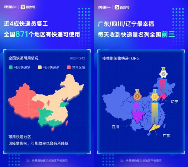 當身邊習以為常的快遞突然不見,才知道我們已經(jīng)完全離不開它的存在。好消息是《疫情期間全國快遞恢復大數(shù)據(jù)報告》顯示:近4成快遞員已經(jīng)復工,全國已有871個地區(qū)有快遞可用,可用快遞覆蓋區(qū)域已經(jīng)超過一半。其中廣東、四川、遼寧等地快遞恢復相對較快,平均每天收到的快遞量排名全國前三。