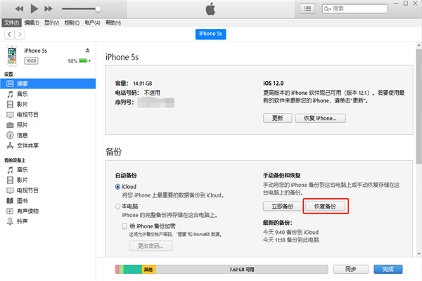 電腦上下載iTunes軟件,利用數(shù)據(jù)線連接到電腦。點擊小設(shè)備圖標,進入iTunes的主界面后,點擊【恢復(fù)備份】即可開始恢復(fù)備份文件到手機。注意:用這種方式恢復(fù)數(shù)據(jù)需要之前用iTunes備份過數(shù)據(jù)。